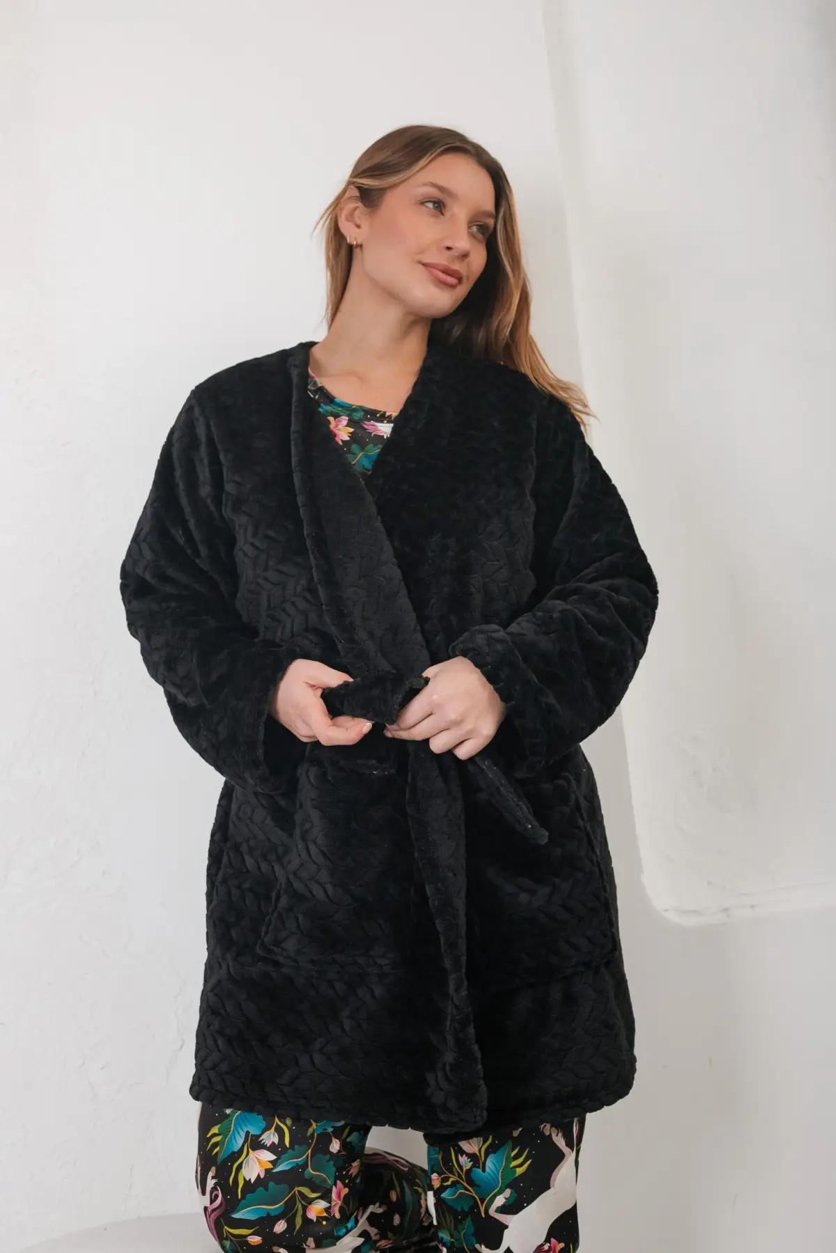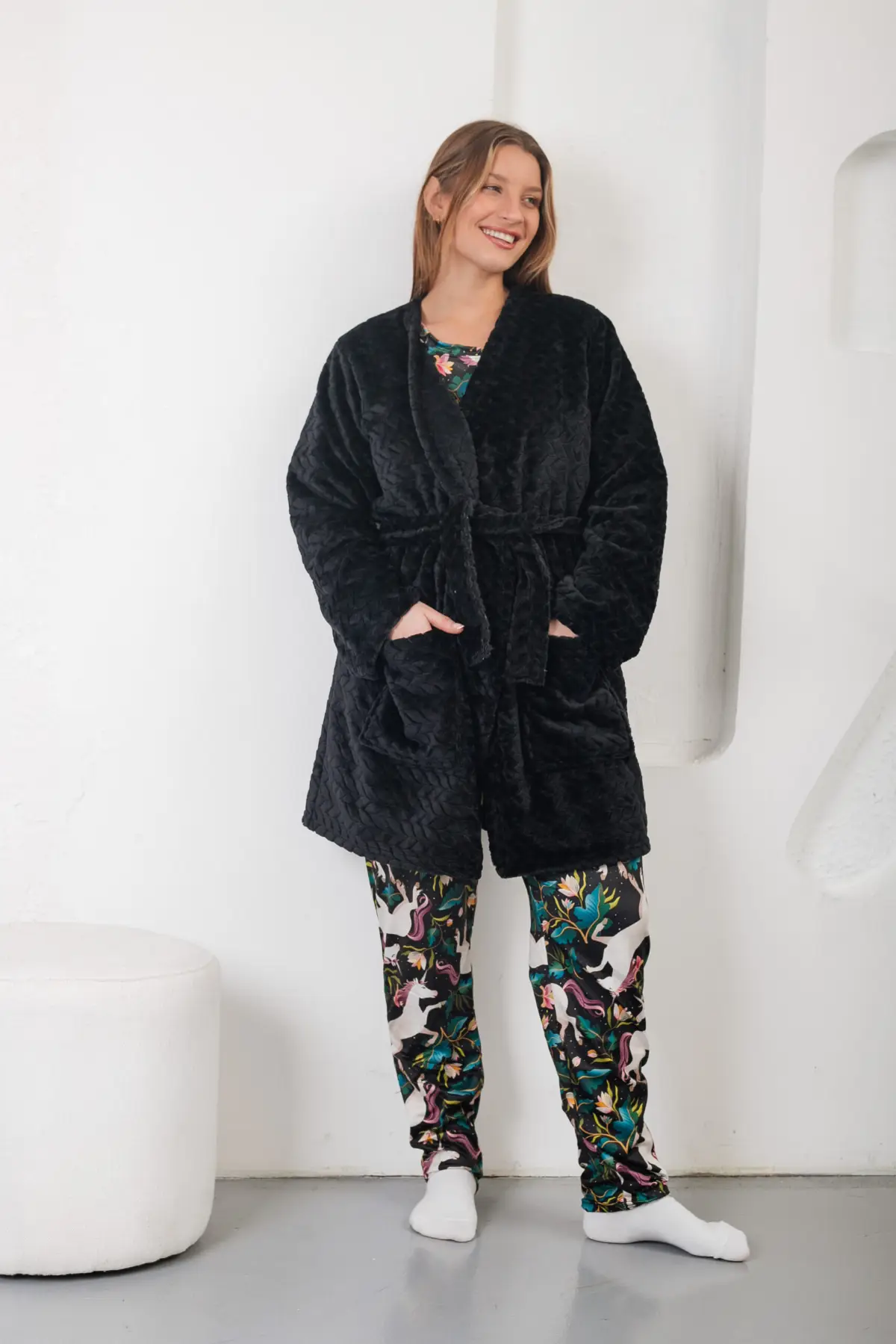 Confección: Polar grueso con spiga abrigado. Incluye tira de la misma confección a la cintura para atar.