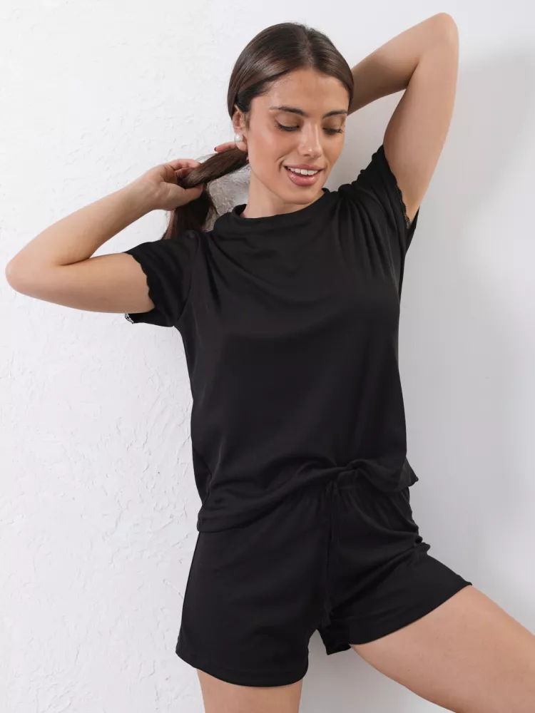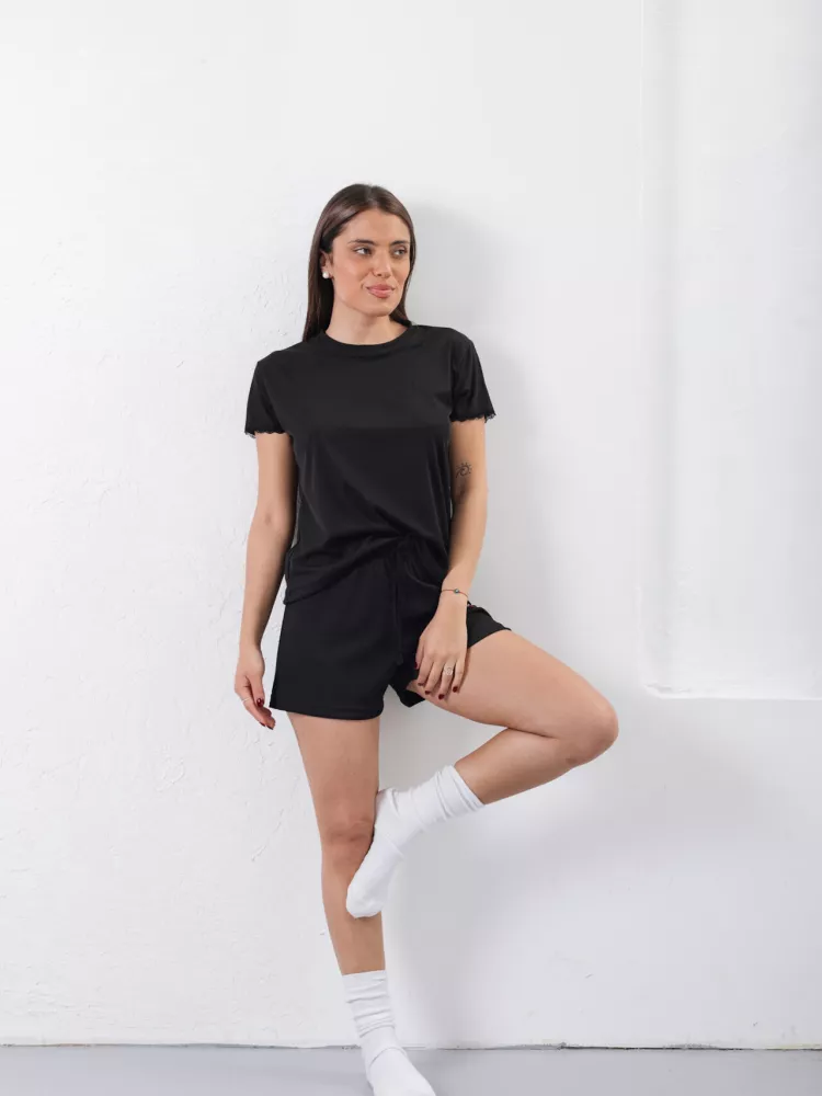 - Manga corta + shorts. Con terminación puntilla en mangas y detalle en shorts